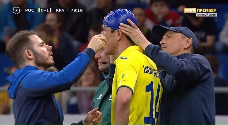 Шомуродов вышел на поле на 66-й минуте, а на 79-й столкнулся головами с Мартыновичем и получил рассечение. Как выяснил Sports.ru, клубные медики надели резиновую шапочку, чтобы зафиксировать повязку – рассечение у нападающего было в таком месте, где любая другая фиксация может слететь.
