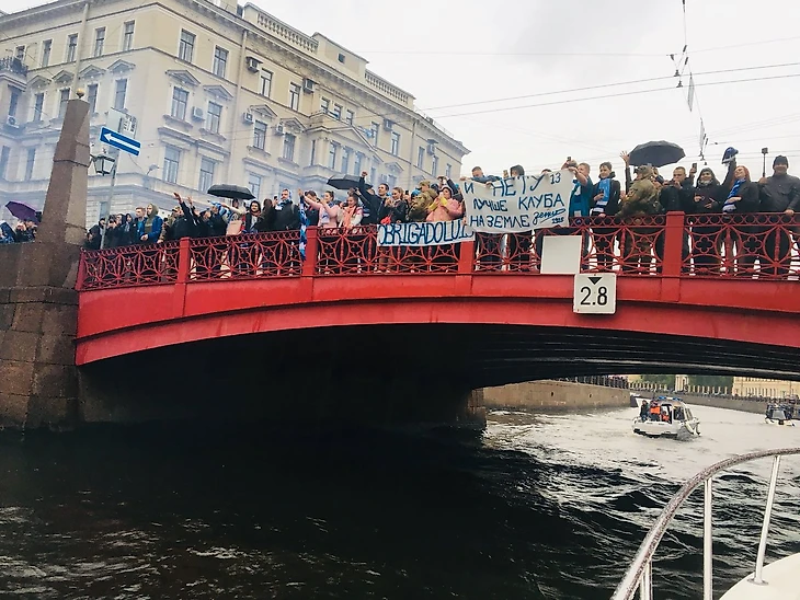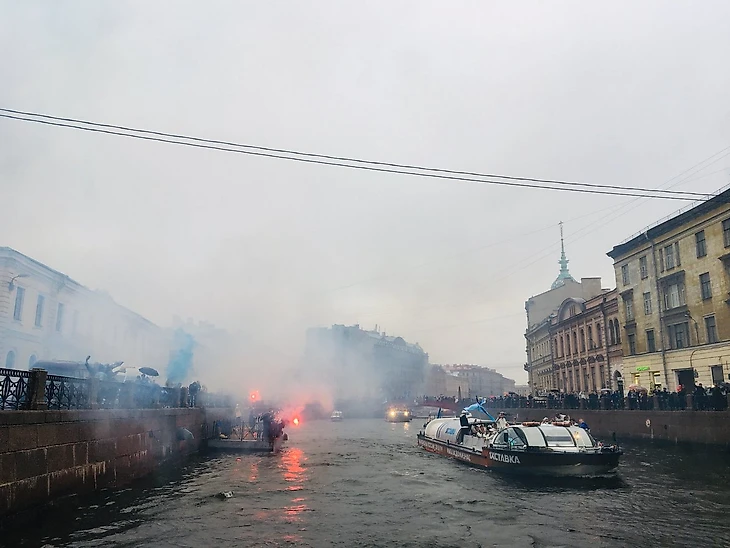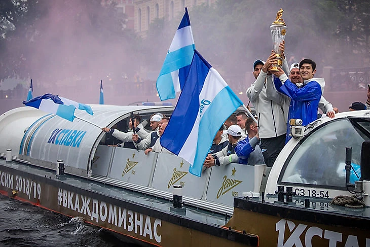Игроки и тренеры «Зенита» передвигались на судне «Пальмира». Это был целый кортеж, «Пальмиру» сопровождали теплоходы с фанатами. На берегу команде салютовали болельщики.