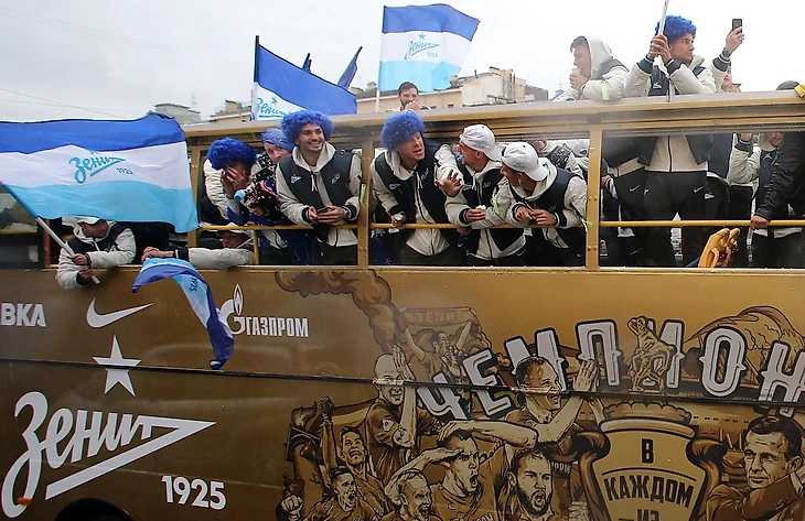 Во второй части парада игроки и тренеры «Зенита» пересели на автобус, который отправился от Шереметьевского дворца до «Петровского».