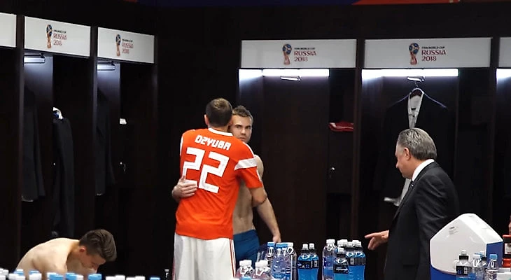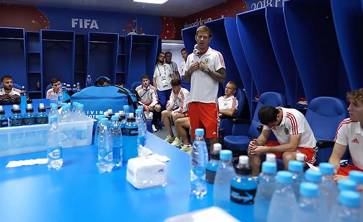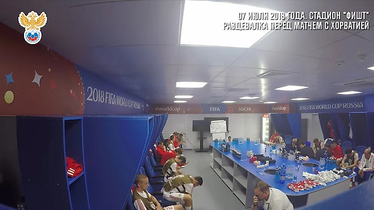 Интервью Акинфеева прерывают уникальные кадры, которых мы не видели раньше: Смолов произносит речь в раздевалке, извиняясь за промах: