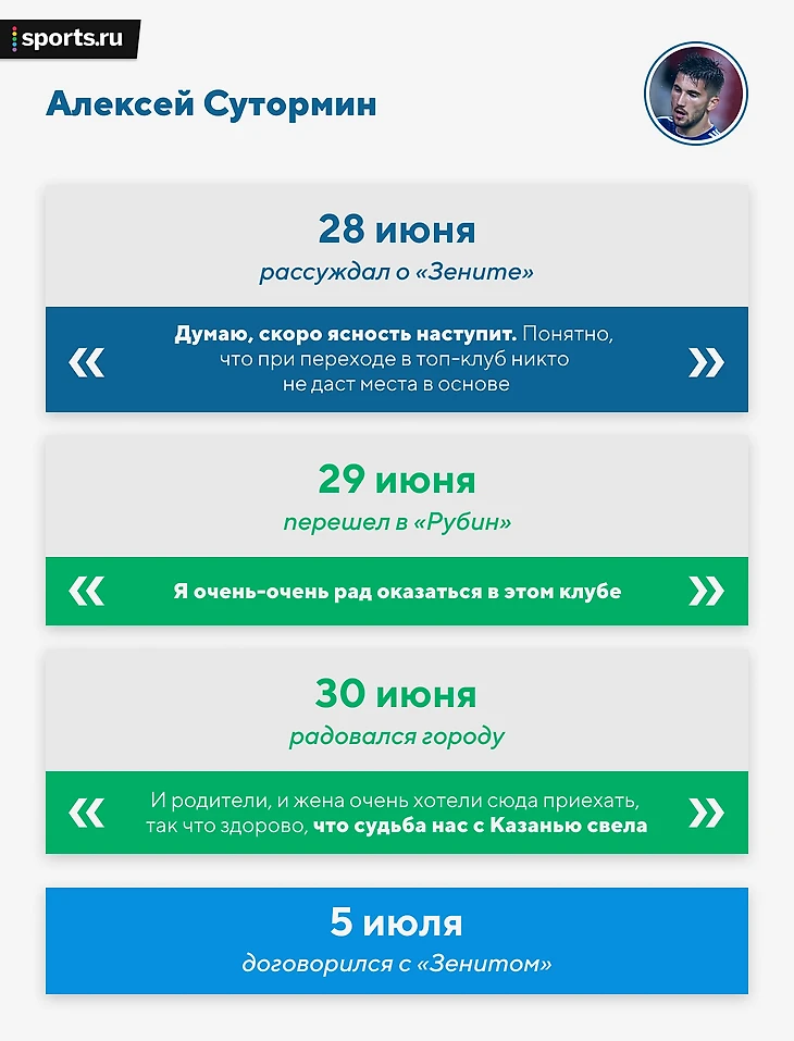 • Все это выглядит очень странно. Еще 28 июня Сутормин рассуждал о «Зените», 29-го перешел в «Рубин», а 30-го радовался, что будет играть в Казани: «Хорошо все, хорошая команда и коллектив. Адаптация проходит, надеюсь, она пройдет как можно быстрее и к сезону подойдем в полной боевой готовности.
