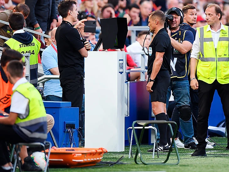Владислав Безбородов сначала поставил штрафной, но потом пошел смотреть видеоповтор.