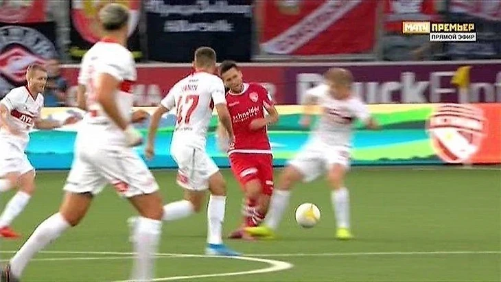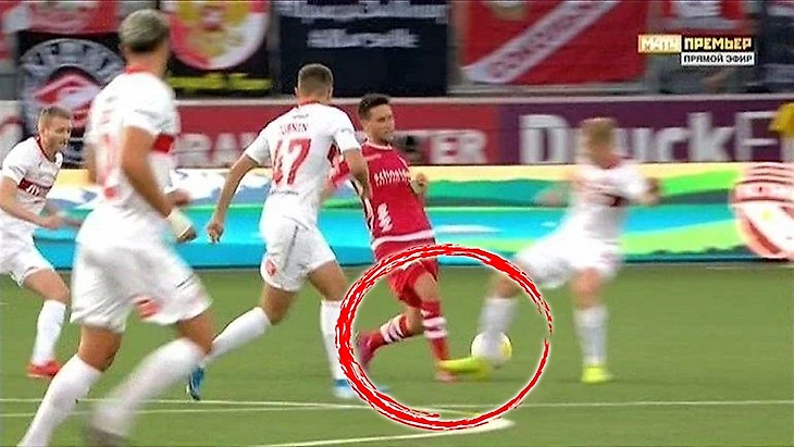Но, кажется, гол Бакаева нельзя было засчитывать. Все дело в том, что атака «Спартака» началась с фола: Рассказов в центре поля отобрал мяч у Свена Жосса с нарушением правил. Смотрите сами.