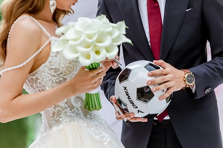 Свадьба Алексея и Марины не обошлась без футбольных отсылок. Событие пара планировала год назад: сначала назначили на 1 июня, но решили перенести на неделю позже из-за возможных стыковых матчей «Оренбурга».