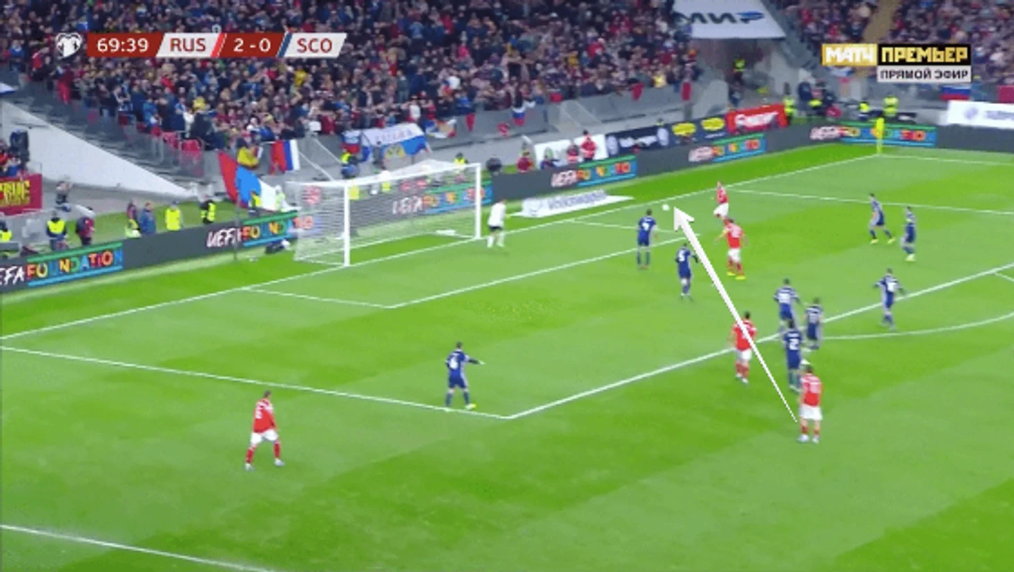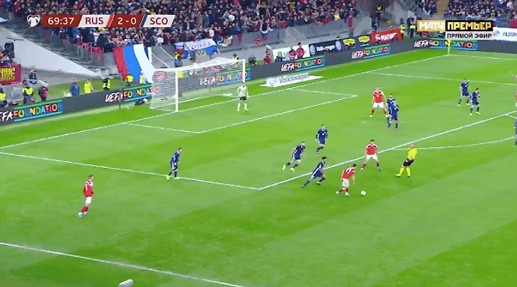 Вот ключевой момент атаки, которая привела ко второму голу Дзюбы. Шотландцы держат позиционную оборону. Все уверены, что сейчас Головин забросит на Дзюбу (он, кстати, пока в офсайде). Но Александр подключает футболиста, которого на этот момент даже нет в кадре (точнее видна только его рука).