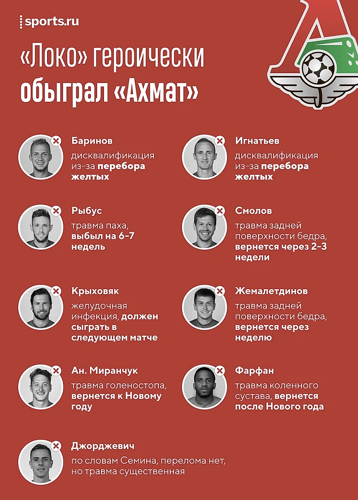 Перед матчем Шалимов отметил, что потери не сильно скажутся на «Локо», который все равно будет агрессивен, – и был прав. В первом тайме гости хоть и меньше били (5:7), но зато больше владели мячом (58% времени). А во втором полностью держали игру под контролем: не дали ничего создать «Ахмату» и периодически сами придумывали моменты. Например, до Жоау Мариу дважды мог забить Миранчук: сначала ловко закрутил со штрафного в ближний, а потом стрелял уже метров с 11, но оба раза выручил Городов.