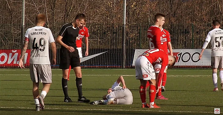 Фомин пошел вперед и после точка Ильи Голосова упал животом на колено Илье Левченкову. Защитник пролежал на газоне несколько минут, а потом самостоятельно ушел с поля, держась за бок.