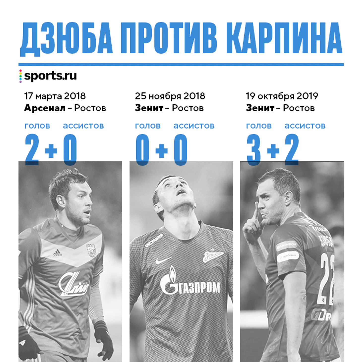 Сегодняшние 5 баллов Дзюбы по гол+пас – повторение рекорда России за те 11 лет, что Opta считает ассисты. В сезоне-2017/18 Александр Ерохин сделал 4+1 в матче с хабаровским СКА, в сезоне-2012/13 Мубарак Буссуфа забил гол и отдал 4 ассиста за «Анжи» в игре с «Краснодаром».