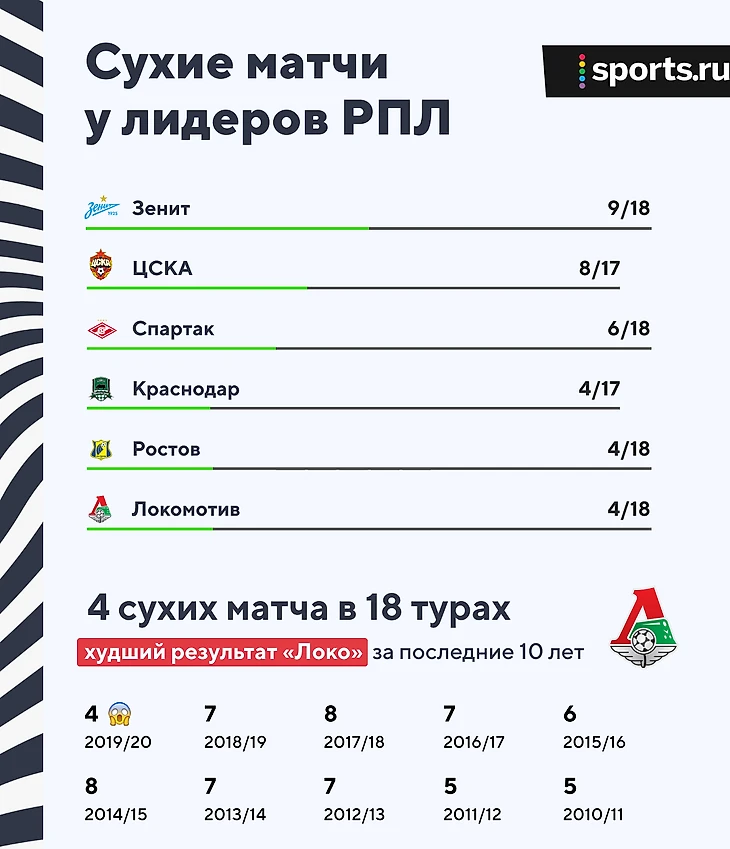 «Локомотив» проиграл «Динамо» (1:2) и снова напропускал. У команды всего 4 сухих матча в 18 играх этого сезона Премьер-лиги. У «Зенита» и ЦСКА в два раза больше, даже у «Спартака» шесть игр без пропущенных.