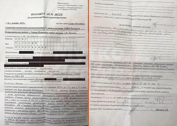 На «Газпром Арене» задержали заводящего с сектора «Спартака» Валерия Бевза (Валера Амиго), который, по данным МВД, инициировал оскорбления Дзюбы. За матерные выкрики он получил протокол по статье 20.31 КоАП РФ («Нарушение правил поведения зрителей при проведении официальных спортивных соревнований»), а потом его отпустили.