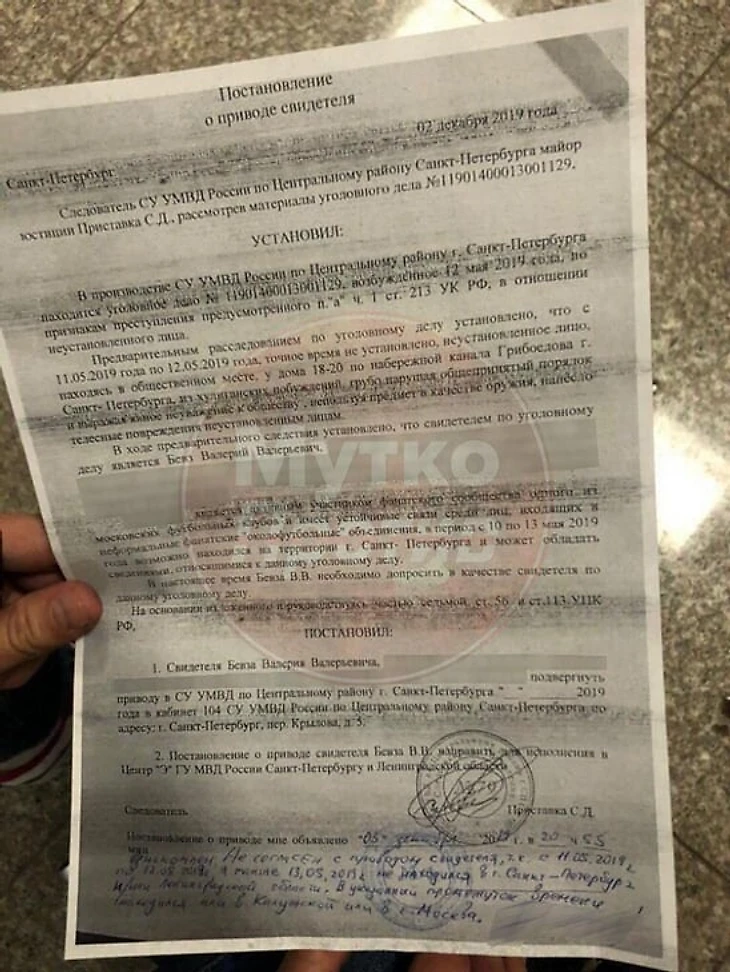 Фаната считают свидетелем по уголовному делу о майской драке в Петербурге на набережной канала Грибоедова (в период с 11-го по 12-е мая). Почему допрашивать Бевза будут только сейчас, неизвестно. К тому же полиция не комментирует фотографию, которая, по данным «Мутко против», подтверждает, что Бевз 12 мая был в Москве на матче «Спартак» – «Уфа».