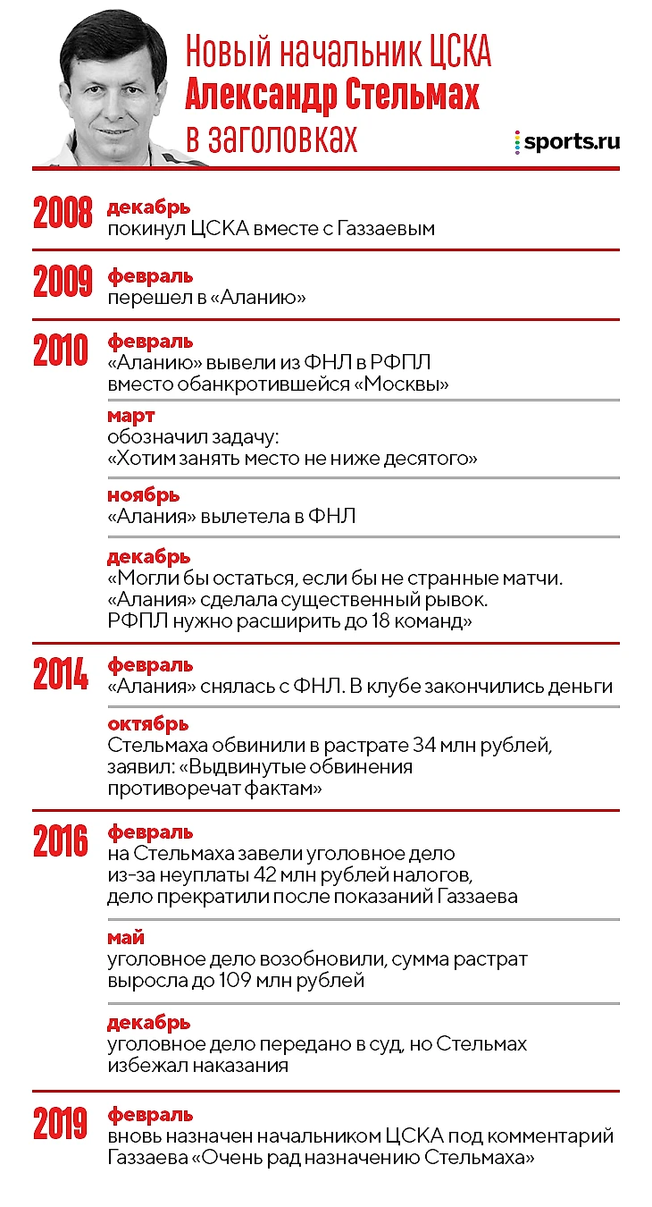 «В ЦСКА новый начальник команды – Александр Стельмах. Очень, очень известный человек. Стельмах исторически – человек Газзаева. Все, кто был человеком Газзаева, со временем становились людьми Гинера, или сходили на нет.И в бригаде Газзаева Стельмах был человеком, который отвечал за судей.