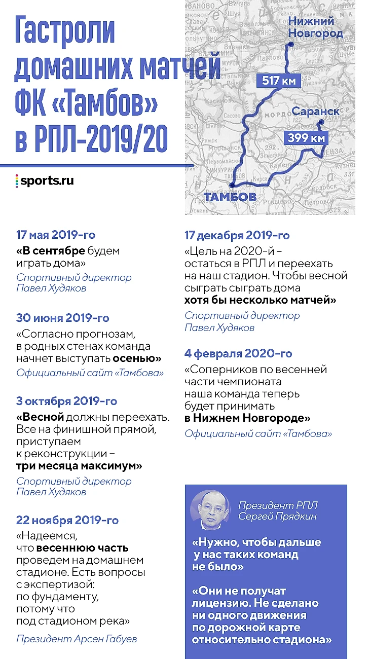 «Тамбов» продолжит играть не в Тамбове. Эта история тянется с самого начала сезона РПЛ-2019/20. Стадион «Спартак» в Тамбове на затянувшейся реконструкции, сколько она продлится – никто не знает. Хотя руководство клуба с сентября обещает, что это вот-вот случится.