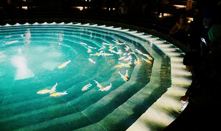 Вокруг пруда установили фонтаны, а чуть дальше водопад.