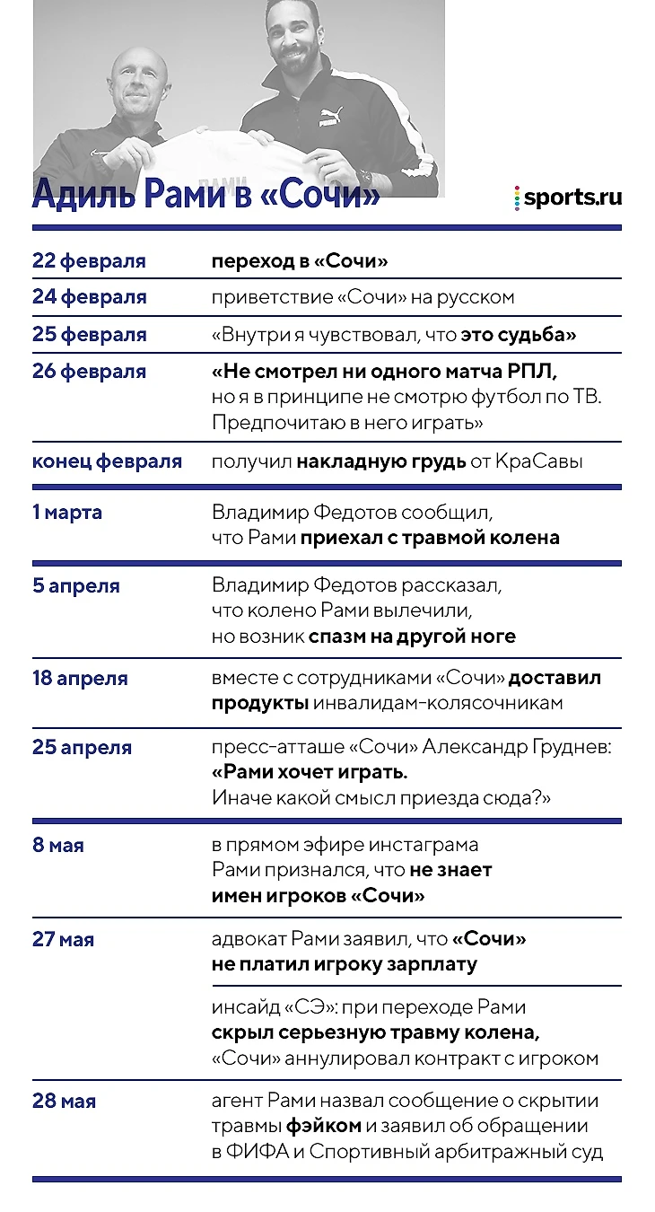 Точно не закончена история Рами и «Сочи»: адвокат защитника заявил, что клуб не платил зарплату, а агент назвал информацию о сокрытии травмы фэйком и сообщил, что у сочинцев будут проблемы с ФИФА и CAS (видимо, представители Рами уже отправили жалобы).