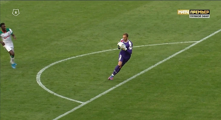 По повторам кажется, что кипер поймал мяч за пределами штрафной (хотя по единственному повтору не под углом можно отстаивать и версию, что проекция мяча – законы геометрии мы изучили на «Открытие арене» – не целиком за штрафной), но главный судья Алексей Сухой не увидел эпизода, боковой ассистент не вмешался.