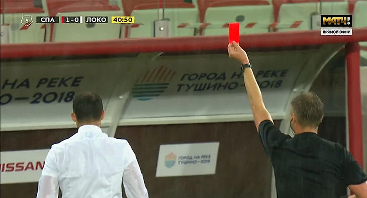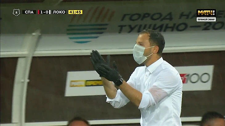 Минуты полторы, когда Миранчук уже был готов бить пенальти, Тедеско не хотел уходить. Он попросил у помощника маску и остался у бровки как будто не заметил красной.