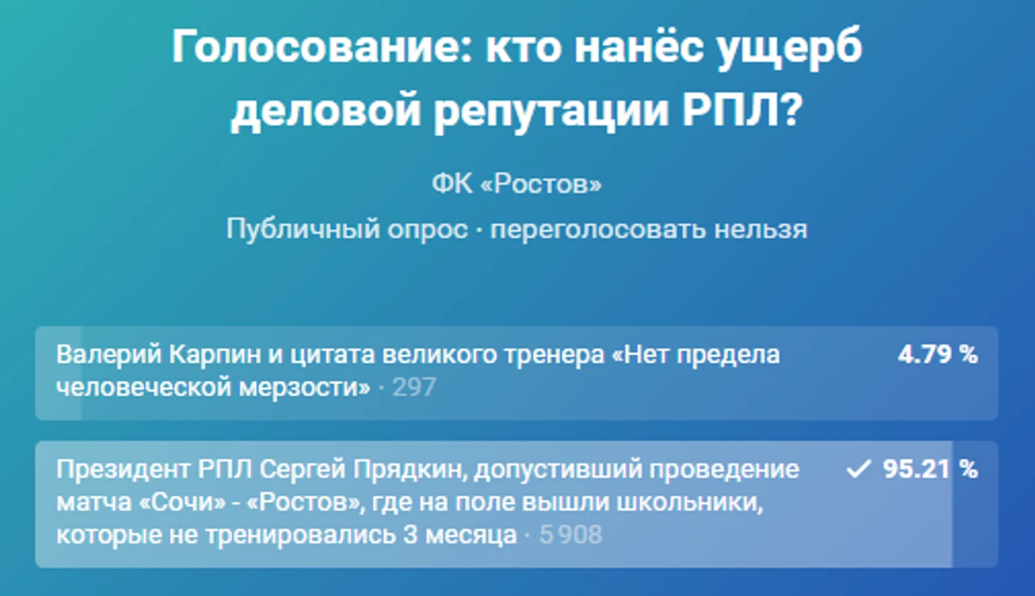 «Ростов» не стал отмалчиваться и устроил в ВК опрос о том, кто именно навредил репутации РПЛ: «Валерий Карпин и цитата великого тренера «Нет предела человеческой мерзости» или «Президент РПЛ Сергей Прядкин, допустивший проведение матча «Сочи» – «Ростов», где на поле вышли школьники, которые не тренировались 3 месяца».