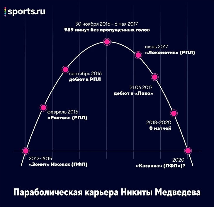 В итоге за три года в «Локомотиве» Медведев сыграл в двух матчах. 21 сентября 2017-го проиграл в Кубке «Крыльям» (2:3), а через полтора месяца «Локо» в группе Лиги Европы прибил «Шериф»: Никита вышел на замену в первом тайме после травмы Гильерме и сначала пропустил в ближний угол, а потом из-за штрафной.