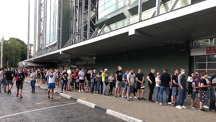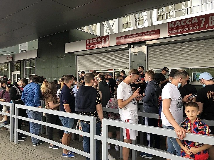 Учитывая, что с нового сезона разрешили пускать 25% от вместимости стадиона, а «Арена Химки» вмещает 18 тысяч, очередь превратилась в бесконечную ленту.