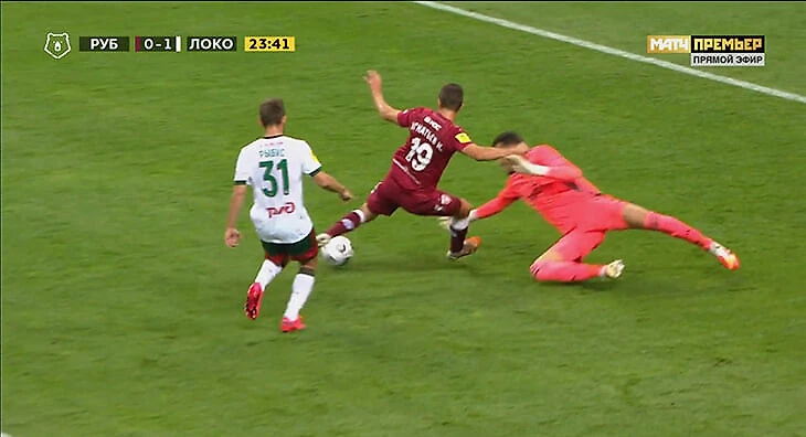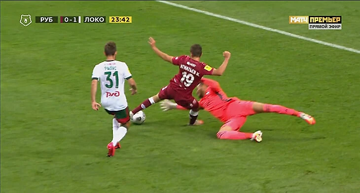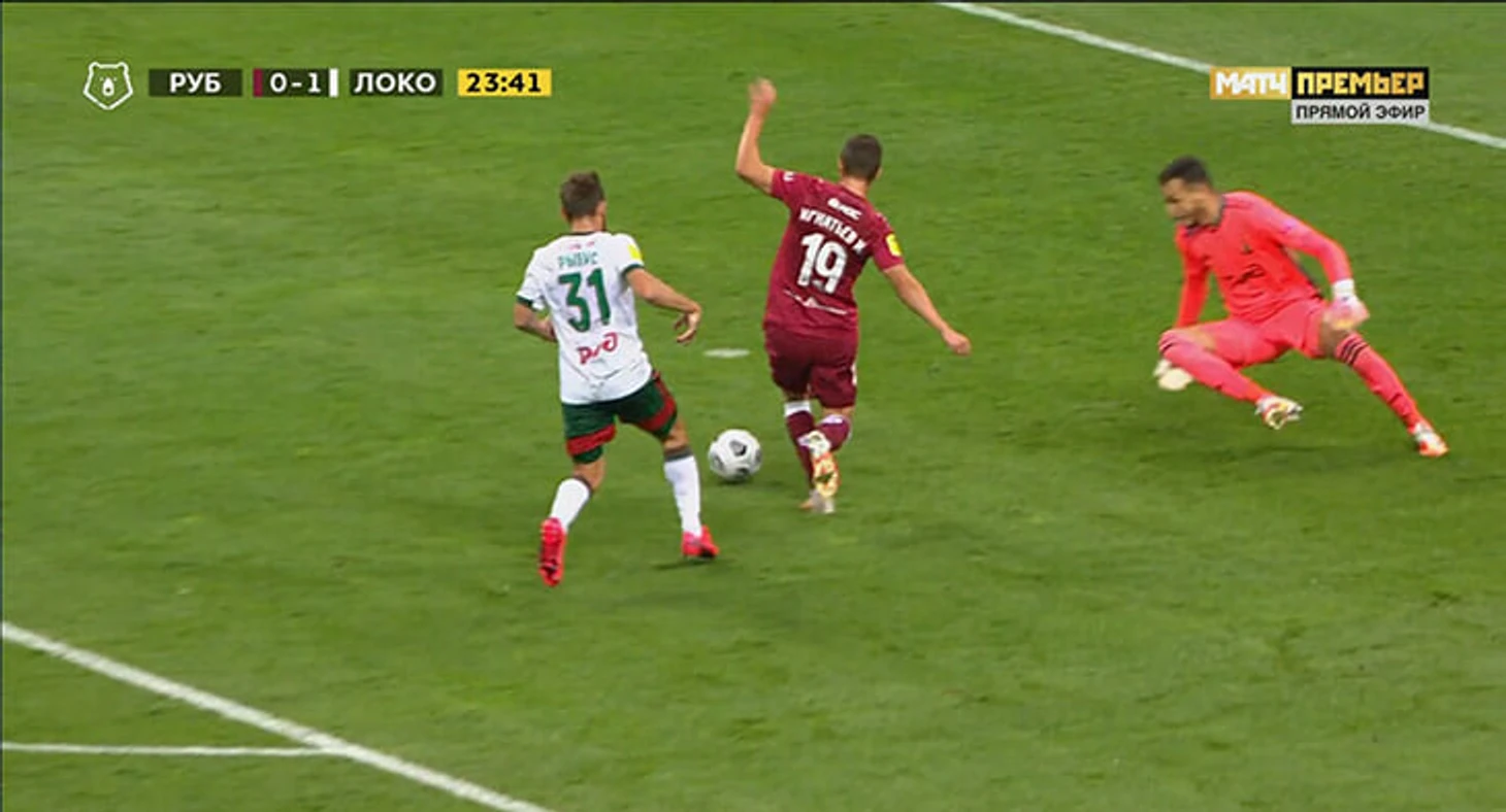 В матче «Рубина» и «Локо» тоже было нервно и странно. Миранчук открыл счет уже на 2-й минуте, а на 26-й забил Баринов. Но за минуту до второго мяча шикарный момент был у Ивана Игнатьева. Кварацхелия технично и резво протащил мяч со своей половины и умным пасом вывел форварда один на один. Игнатьев неудачно пробил, но были причины. При входе в штрафную его зацепил рукой Рыбус, а затем в ноги влетел Гильерме.