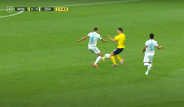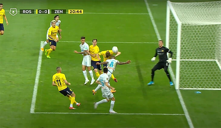 И момент, благодаря которому «Зенит» открыл счет: Малком пытался скинуть головой вдоль ворот, Евгений Чернов выпрыгивал мешать – но руки расставил как крылья. Мяч попал ему точно выше локтя, ВАР зафиксировал игру рукой – похоже, что так и есть. Момент обидный для Чернова и «Ростова», но все-таки сейчас действительно такие касания, которые влияют на эпизод, трактуются в пользу атаки.