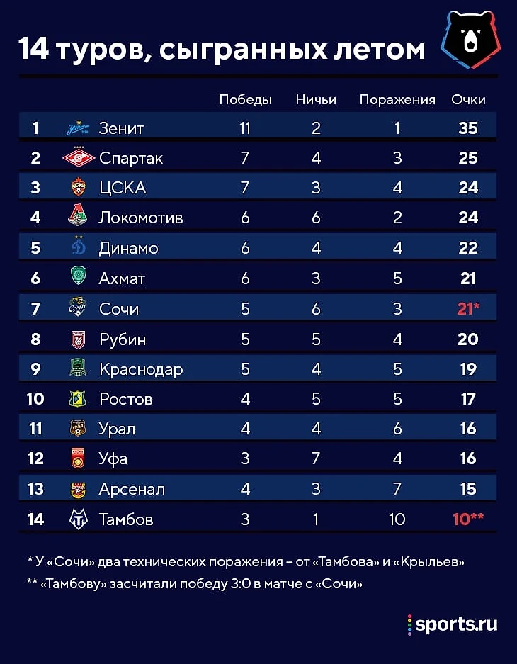 Летом российские команды отыграли 14 туров за 56 дней – матч раз в 4 дня. Это только в РПЛ: некоторые играли чаще – например, у «Зенита» 17 матчей за 60 дней (раз в 3,5 дня). При этом чемпион лучше всех прошел летнюю дистанцию.