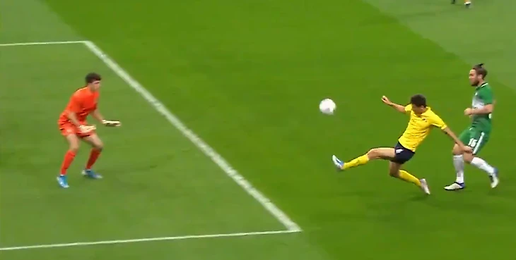 В итоге имеем примерно 7 метров от центра в момент паса и примерно 7 метров от ворот в момент удара, вычитаем из 52-х метров 14 и получаем 38 м, плюс-минус пара метров. Так что это скорее пас на 40 метров, чем на 30.