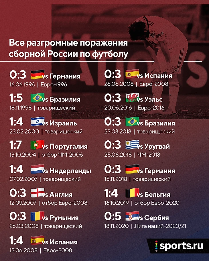 Все крупные поражения сборной России: теперь их 15. Отлетаем хотя бы раз уже три года подряд