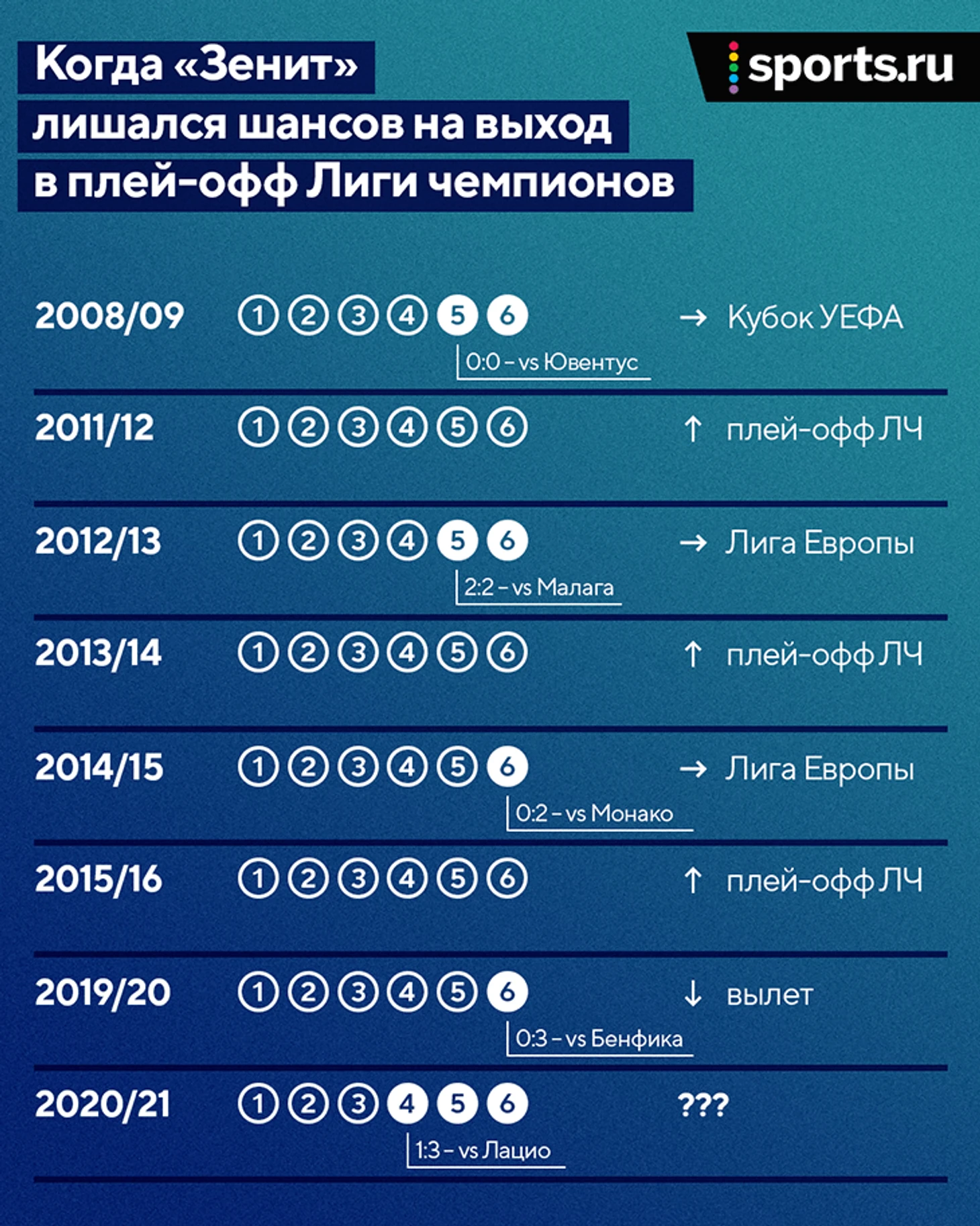 • Это самый ранний вылет «Зенита» из группы: при предыдущих попытках, когда добирались до этой стадии, сохраняли шансы как минимум к пятому туру. В 2008-м и 2012-м теряли надежду на плей-офф после предпоследнего матча (играли вничью с «Ювентусом» и «Малагой» соответственно), а в 2014-м и 2019-м претендовали до последнего – мешали выездные поражения от «Монако» и «Бенфики».