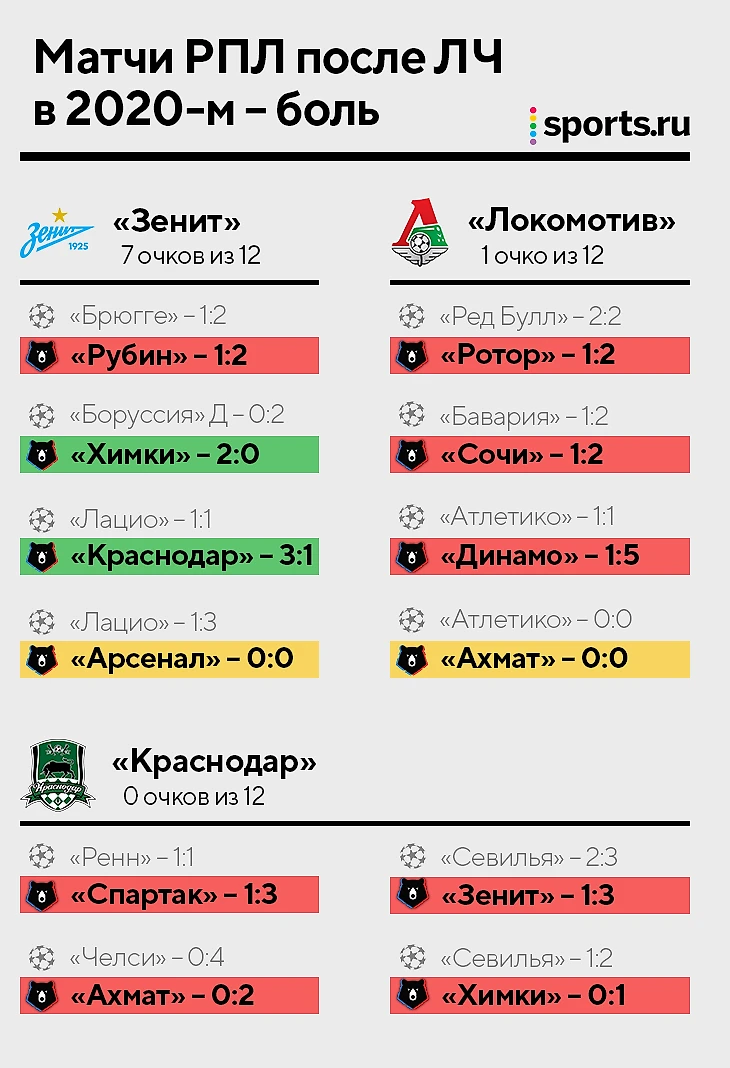 Матчи наших в РПЛ после ЛЧ – боль: «Краснодар» проиграл все, «Локо» только что взял первое очко, «Зенит» не выиграл половину