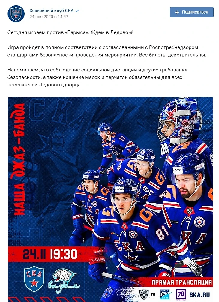 В понедельник, 30 ноября, СКА сыграет дома с «Йокеритом». Вечером 29 ноября питерский клуб продавал билеты на клубном сайте, но не объяснял причины допуска зрителей. В открытом доступе Sports.ru не нашел документов, разрешающих заполнение трибун на питерских матчах КХЛ.