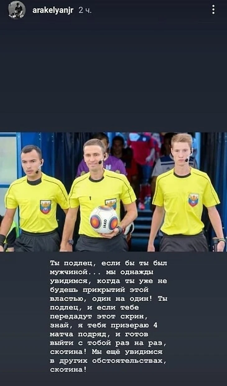 В инстаграме он эмоционально обратился к судье Кошко: «Ты подлец, если бы ты был мужчиной… Мы однажды увидимся, когда ты уже не будешь прикрыт этой властью, один на один! Ты подлец, и если тебе передадут этот скрин, знай, я тебя презираю. 4 матча подряд. Готов выйти с тобой раз на раз, скотина! Мы еще увидимся в других обстоятельствах, скотина!».