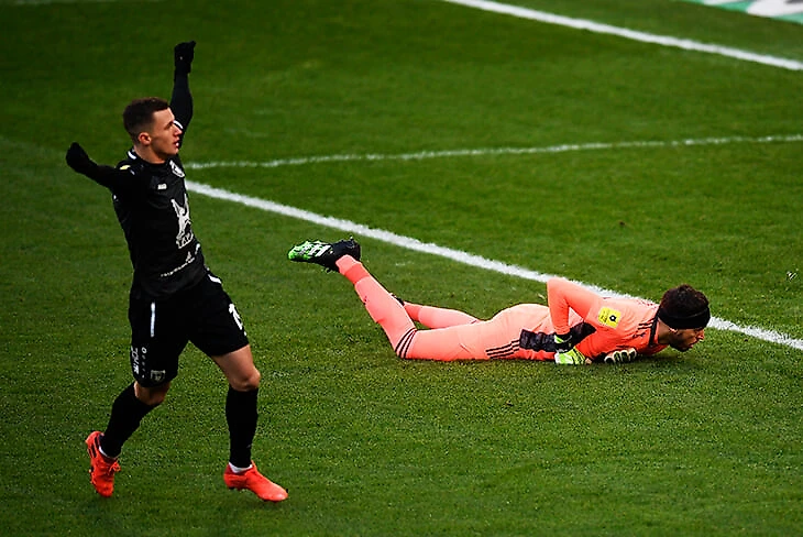 Правда, на одном голе вратарь «Рубина» не остановился: в середине второго тайма на выходе влетел в Игнатьева коленом. Теперь Карасев посмотрел эпизод сам – пенальти! Медведев угадал угол, но Миранчук пробил идеально под штангу.