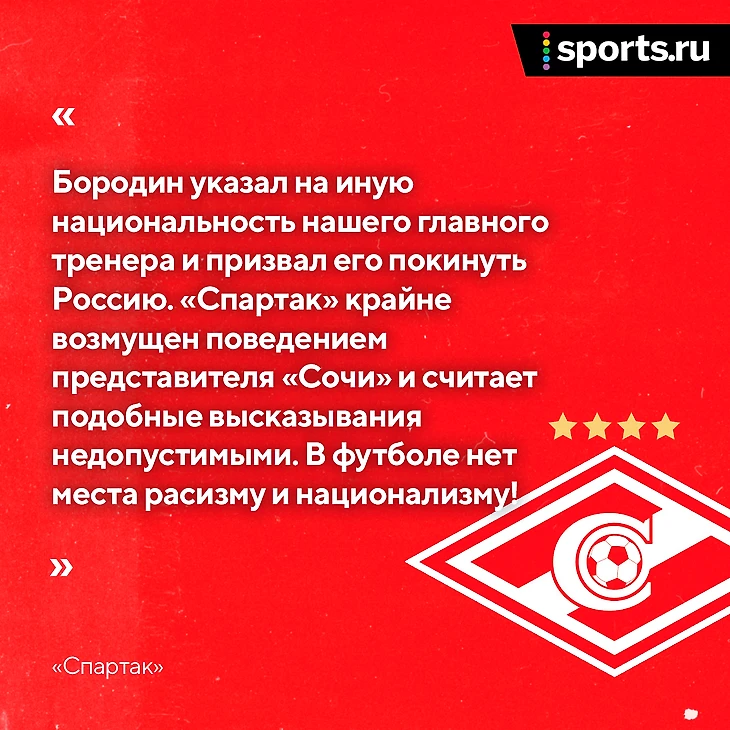«Сочи» тоже выпустил свое заявление – правда, половину его потратив на восторги фан-сектором «Спартака», создававшим на «Фиште» атмосферу. О словах Бородина клуб не высказался.