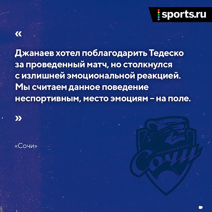 Финальный эпизод: в подтрибунке «Фишта» Доменико не угодил капитан «Сочи», в прошлом спартаковец Сослан Джанаев. И тренер «Сочи» Фоменко, и гендиректор Рубашко, и сам вратарь сообщили: Джанаев протянул Тедеско руку, но столкнулся с агрессией.