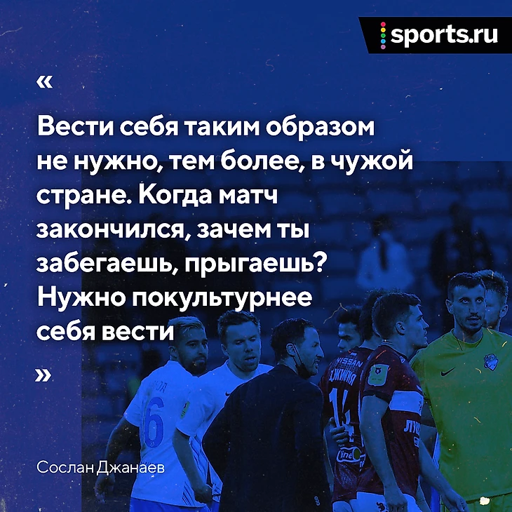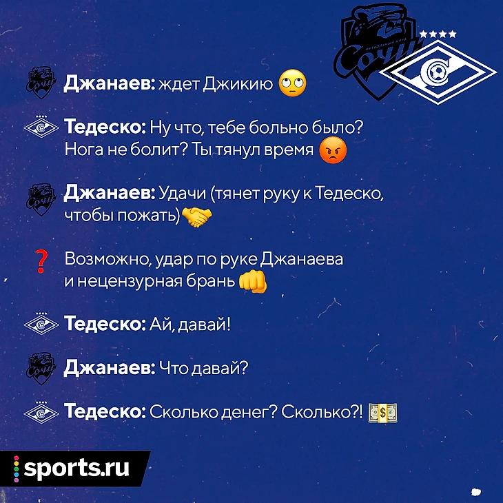 «Он начал обвинять меня в симуляции после того эпизода, когда Понсе наступил мне на ногу, – объяснил Сослан «Спорт-Экспрессу». – Подошли ребята из «Спартака», начали уводить Тедеско в сторону, зная, что он человек импульсивный. Потом подключился его помощник (Хинкель), начали прыгать через толпу». Рубашко вообще заявил, что Джанаева ударили по протянутой.