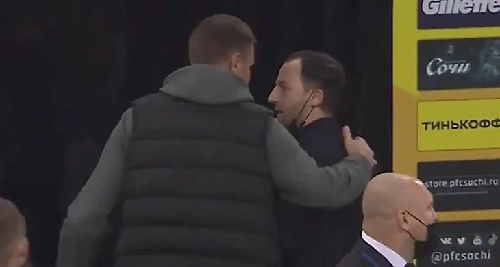 Заканчивается первый тайм, команды уходят в раздевалки. У туннеля пересекаются тренер «Сочи» Дмитрий Бородин (главный Владимир Федотов отбывал дисквалификацию) и Тедеско. Бородин протягивает руку, Тедеско тянет в ответ свою, но в итоге накрывает левой. И начинает что-то выговаривать на повышенных тонах, активно жестикулируя. Доменико мотает головой, а Бородин кладет ему руку на плечо.