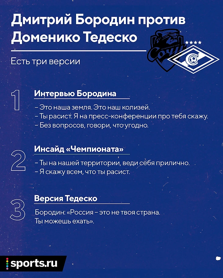 Андрей Панков из «Чемпионата» приписал Бородину такие слова: «Ты на нашей территории, веди себя прилично». Бородин в интервью Sport24 процитировал сам себя: «Это наша земля и наш колизей, хоть вы и «Спартак». Чуть позже Дмитрий уточнил детали диалога и повод для своих слов: «После того, как Тедеско апеллировал к судьям с претензиями, что не засчитали гол, и показывал нам мифические жесты с денежными знаками, намекая на то, что мы себя неправильно ведем, я ему сказал две фразы: «It’s our place. It’s our Colosseum». Формально place переводится как «место», но «земля» тоже уместна.