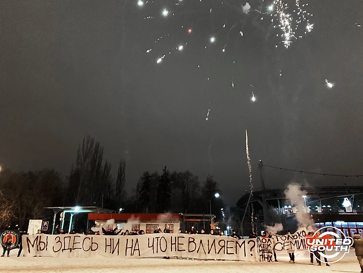 Помимо фейерверков и файеров, фанаты из объединения United South принесли растяжки: «Прощайте, ######### (врунишки)», «Только Семин» и так далее. А главным стал баннер «Мы здесь ни на что не влияем?». Это отсылка к высказыванию Кикнадзе во время публичной перепалки с фанатами на встрече с командой этим летом.