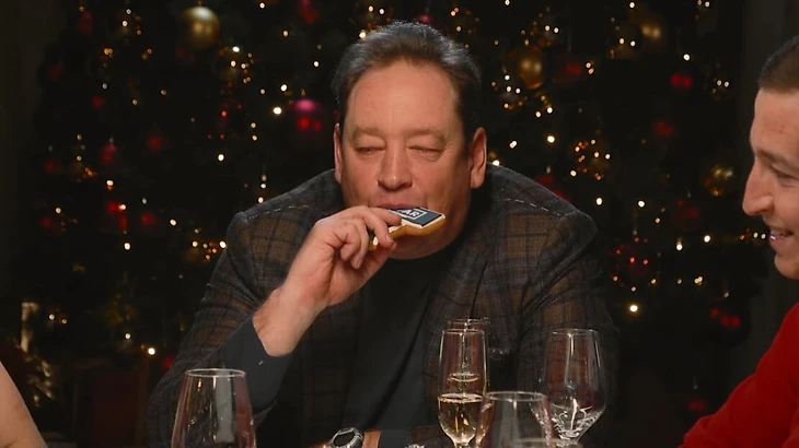 Ну и финиш – застолье с особенным печеньем. Им с наслаждением хрустит Леонид Слуцкий – и как же без ВАР!