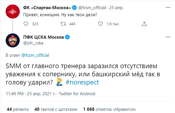 После этого в твиттере красно-белых появилась публикация «Привет, конюшня. Ну как твои дела?» Полагаем, что высказывания подобного рода в адрес соперника, размещенные на официальном канале одного из участником чемпионата, находятся за граню общепринятых этических норм и дозволенных методов поддержки команды».