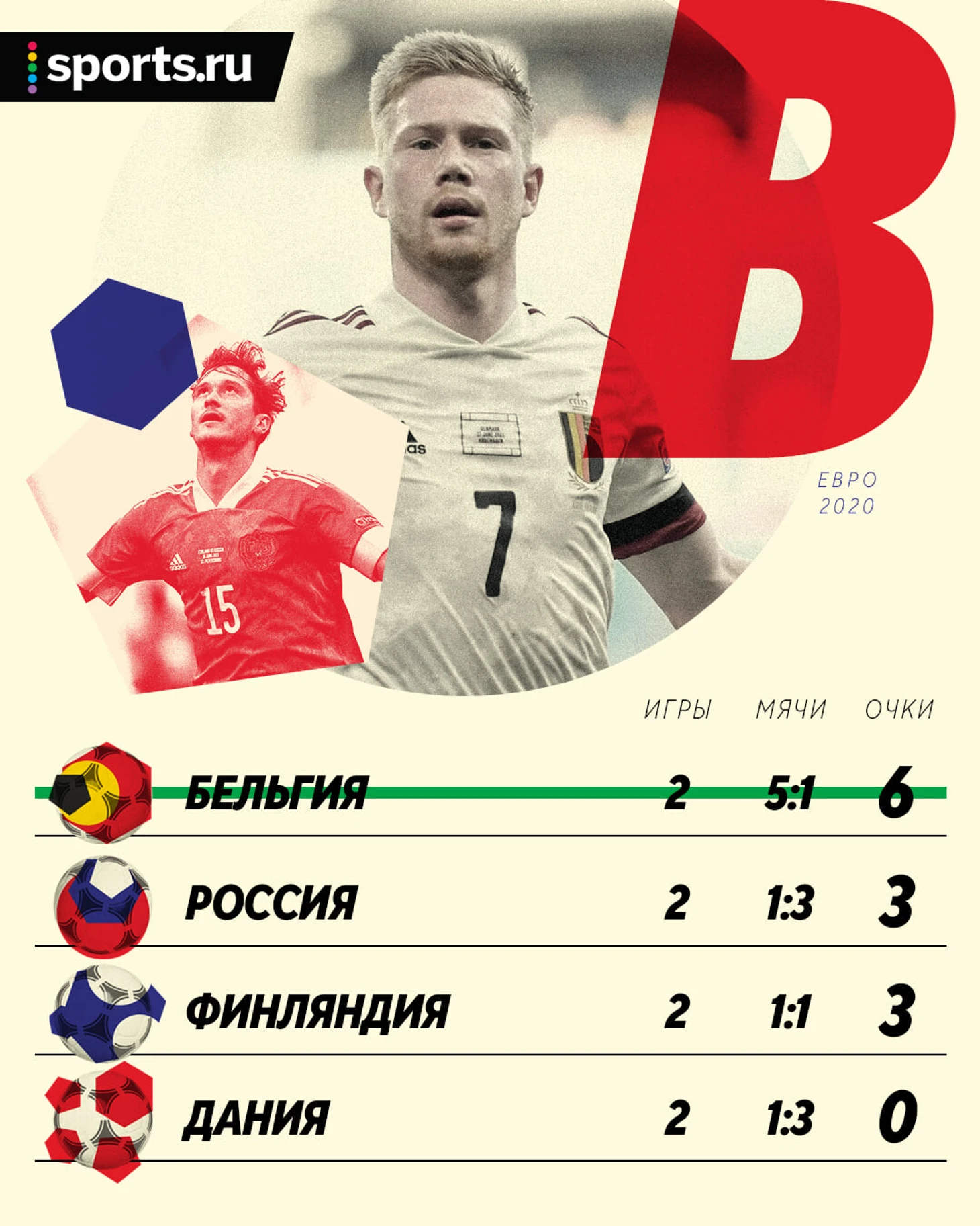 • Если Россия победит Данию – мы (с огромной вероятностью) вторые. Кроме случая с победой финнов над Бельгией – тогда мы будем третьими по разницей мячей между тремя сборными.