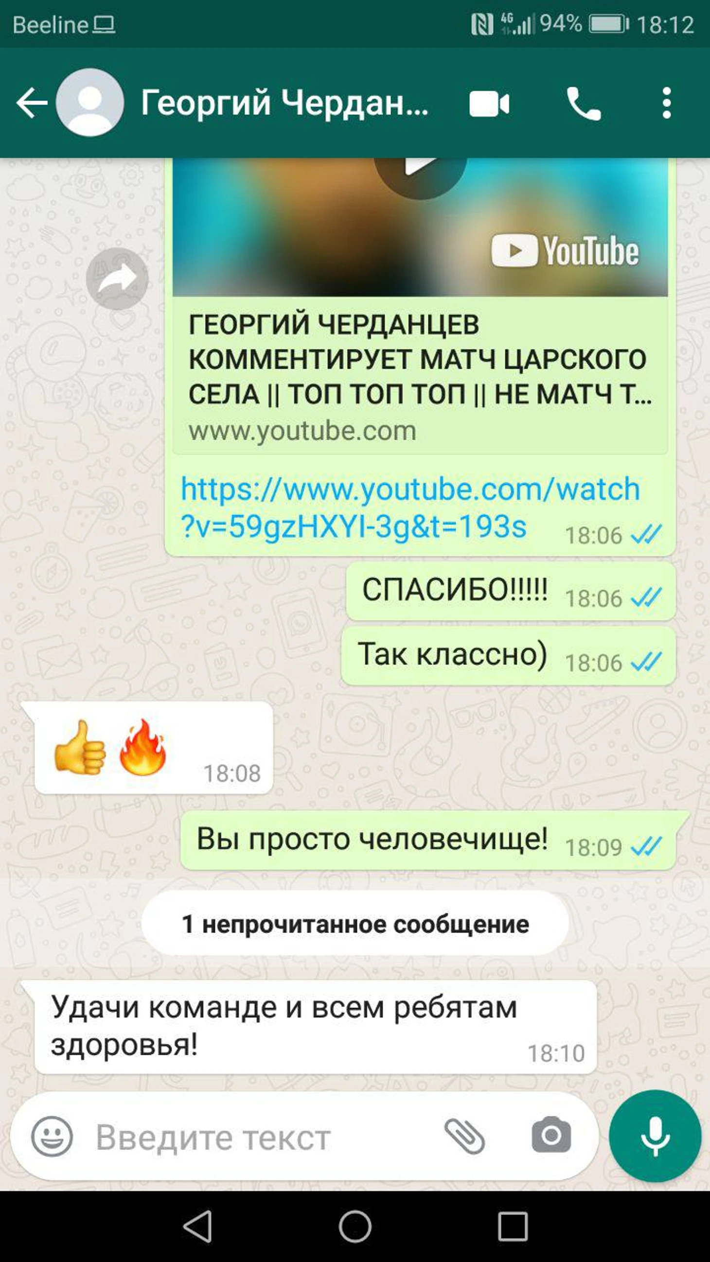 «Огромное спасибо топовому комментатору и спортивному журналисту Георгию Черданцеву, что согласился прокомментировать наш матч! Это лучший подарок в международный день детского футбола! Вы лучший!»