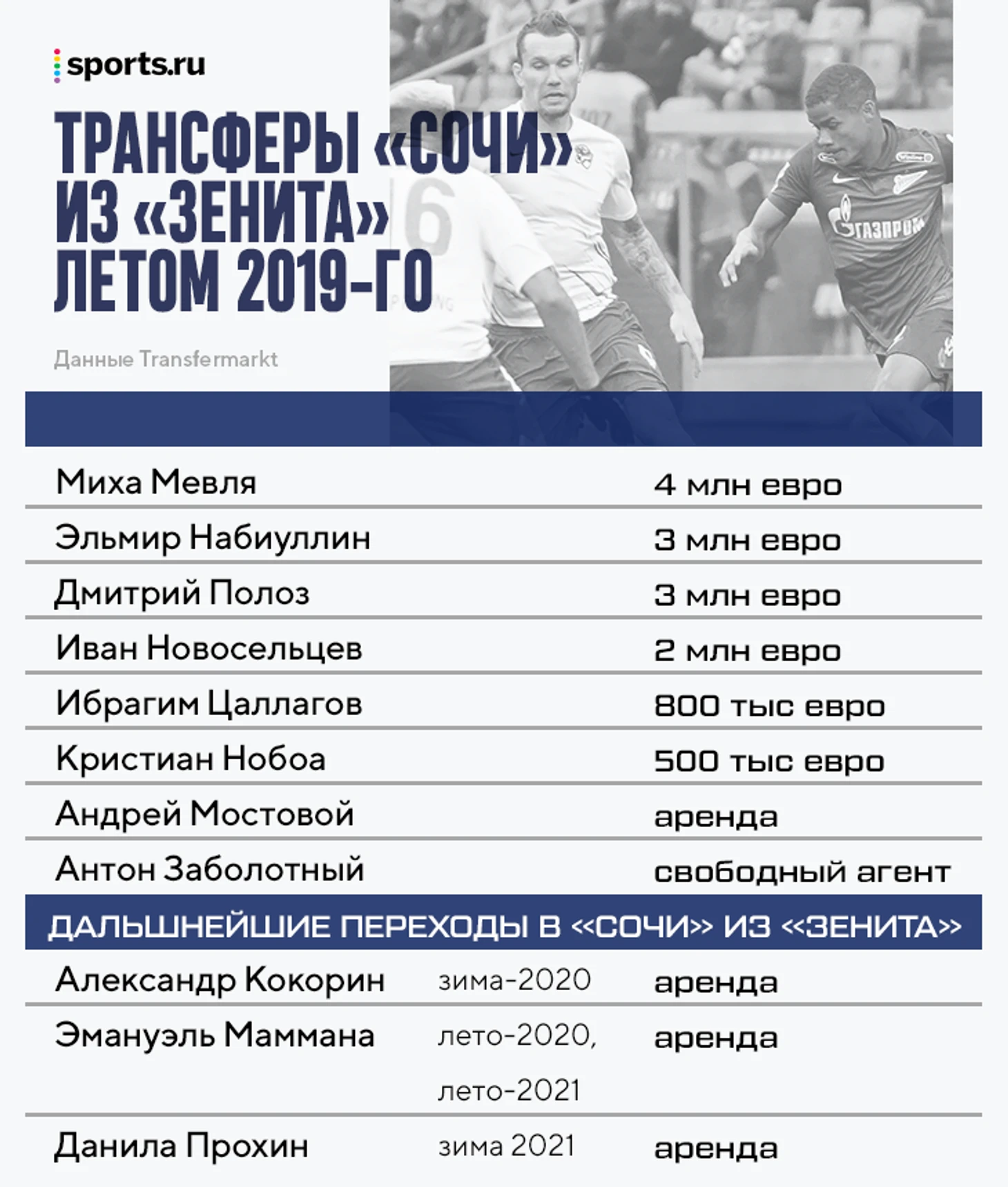 Поигравших за «Зенит» в составе «Сочи» на самом деле больше: есть еще Николай Заболотный (начинал карьеру в «Зените») и Артур Юсупов (играл за «Зенит» за пару лет до перехода в «Сочи»).