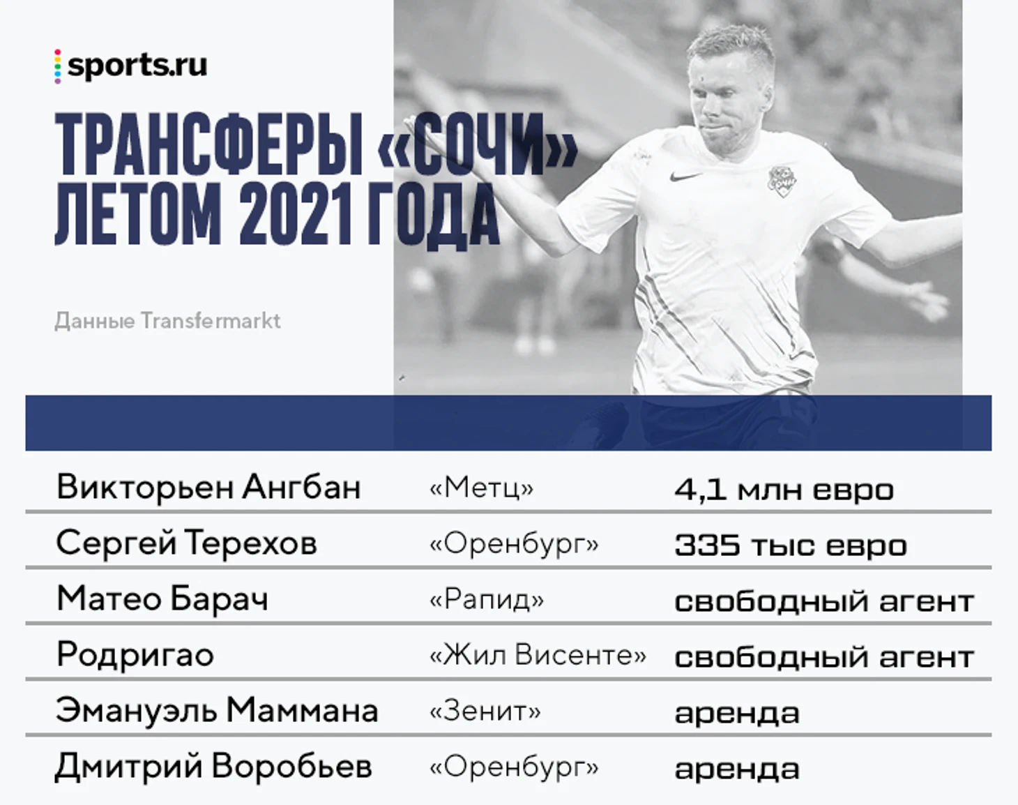 В это трансферное окно «Сочи» формирует состав уже по-другому. Помимо выкупленного Терехова в команду пришли иностранные защитники Барач и Родригао (оба как свободные агенты) и полузащитник Ангбан из «Метца».