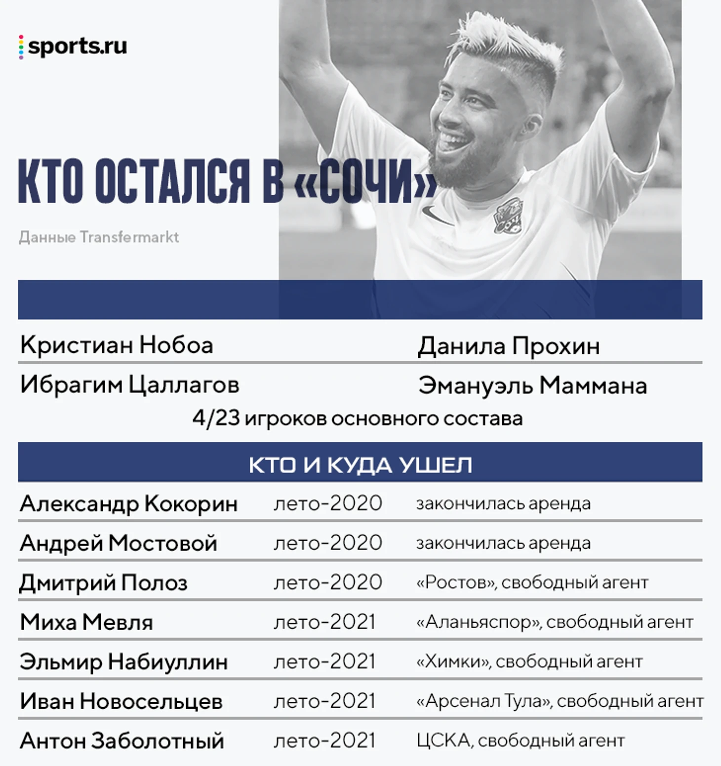 Но постепенно питерское подкрепление покинуло «Сочи». Сейчас в составе всего таких 4 игрока: Нобоа, Цаллагов, Прохин и Маммана.