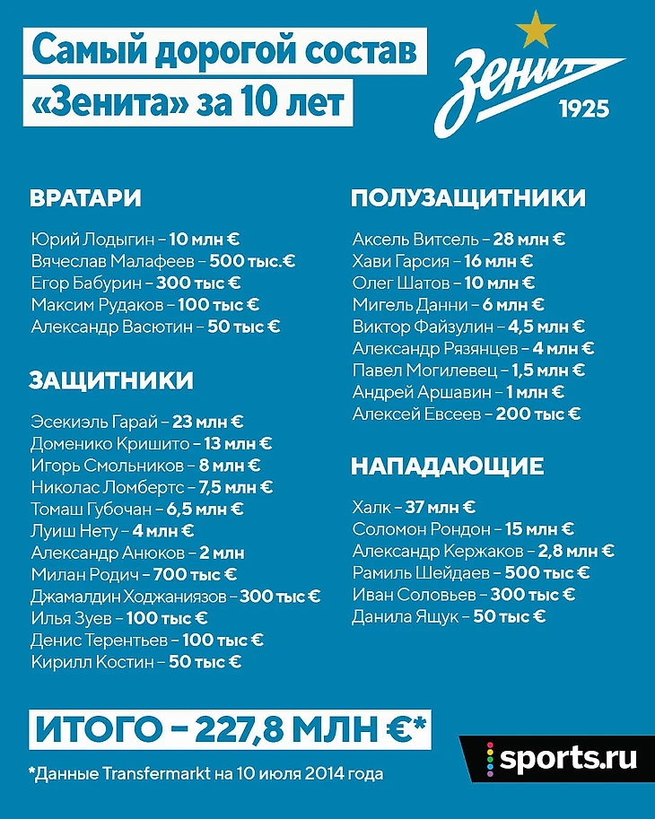 У «Зенита» максимальная оценочная стоимость была 7 лет назад. Тот самый состав с Халком, Витцелем, Данни, Аршавиным и Кержаковым.