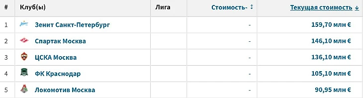 15 марта 2018 года: «Зенит» – 128,8 млн евро, «Спартак» – 121,8 млн.