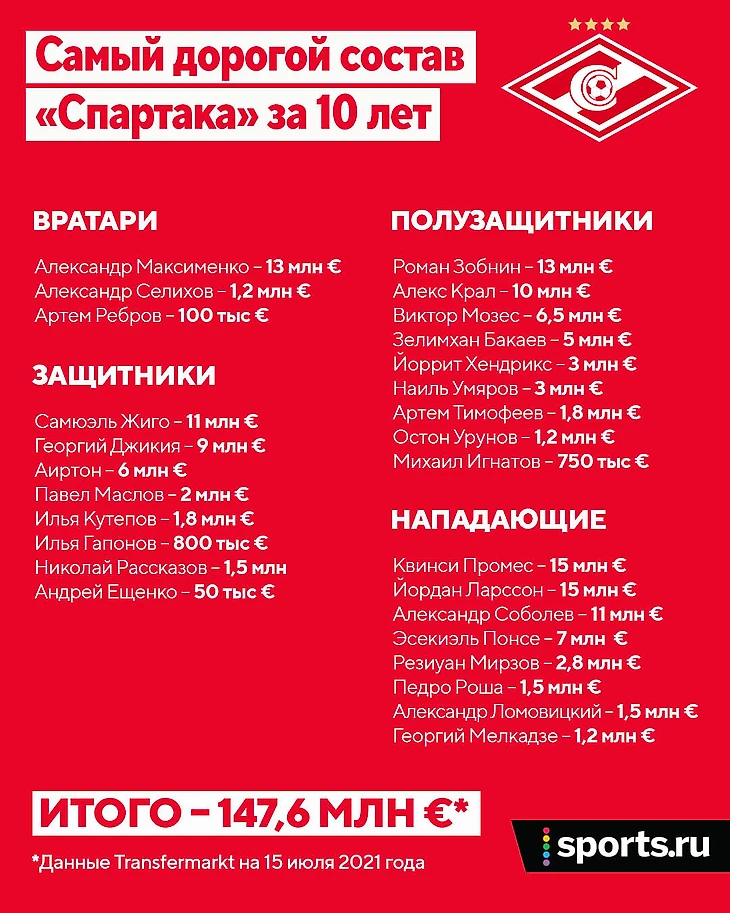 Прямо сейчас у «Спартака» самый дорогой состав за десятилетие.
